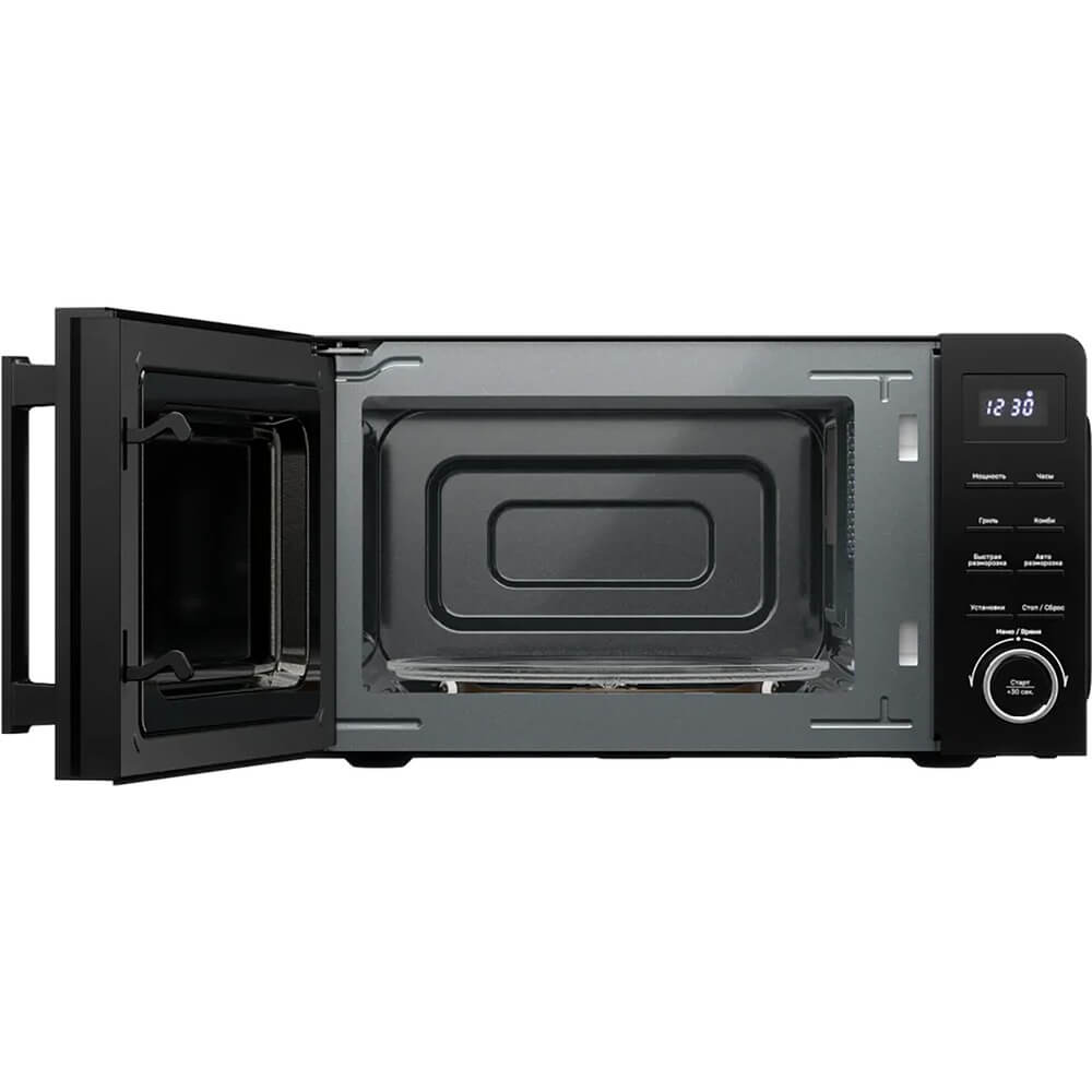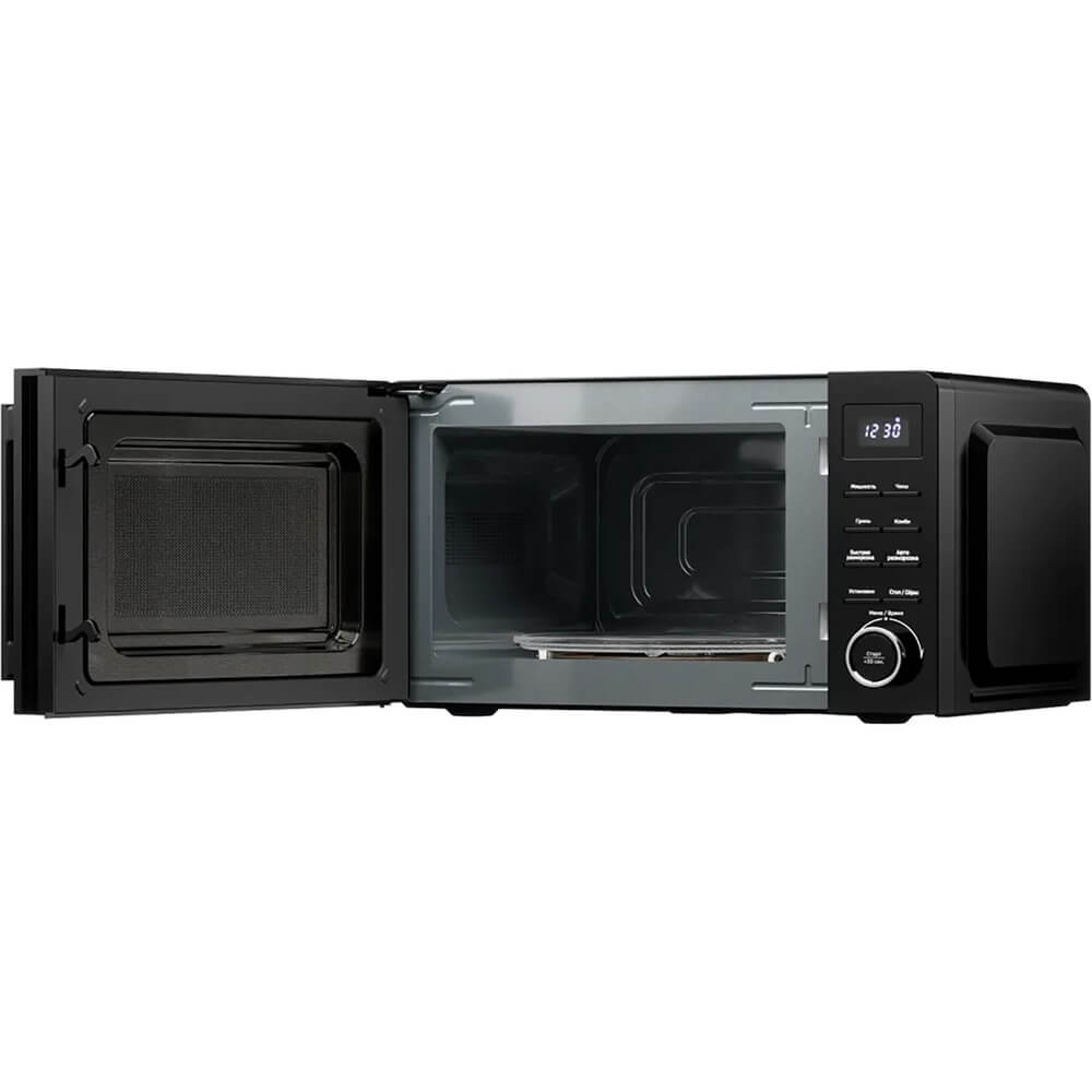 Комфорт в использовании обеспечивают такие функции, как цифровой таймер и блокировка от детей. Внутренний объём микроволновой печи составляет 20 л, что позволяет готовить крупные блюда. Программа размораживания по весу и времени поможет вам быстро и эффективно подготовить продукты к дальнейшему приготовлению. Также стоит отметить, что устройство оснащено внутренним освещением, что упрощает контроль за процессом готовки.